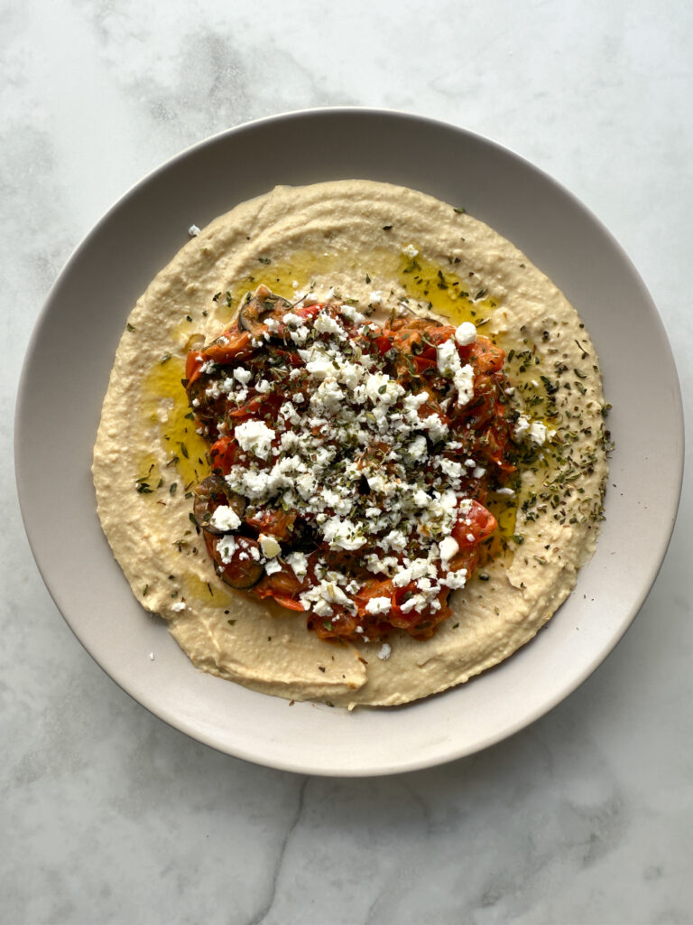 Añade por encima del hummus un poco de queso feta desmenuzado y orégano seco.