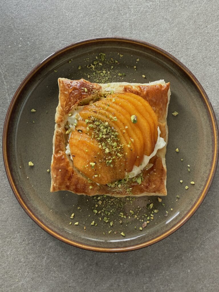 Bocados de hojaldre con melocotón, mascarpone y pistacho