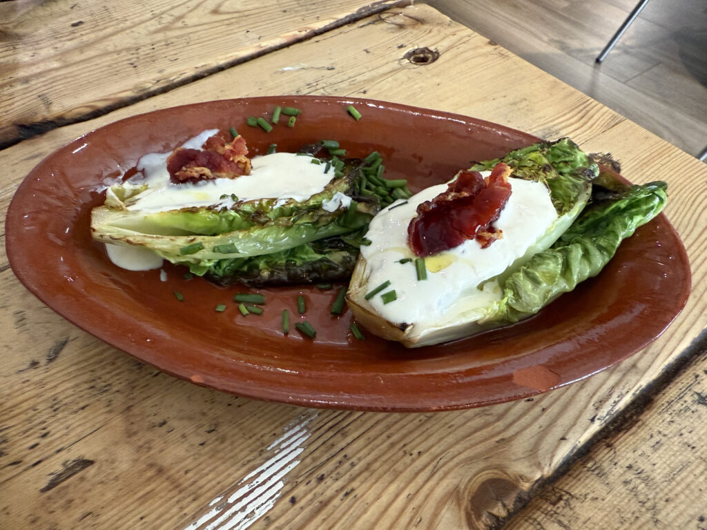 Cogollo a la plancha con crema de huevo frito y crujiente de jamón. Un bocado crujiente por fuera, tierno por dentro y coronado con esa crema que nos hizo repetir mentalmente: «¿Y esto por qué no lo he probado antes?».